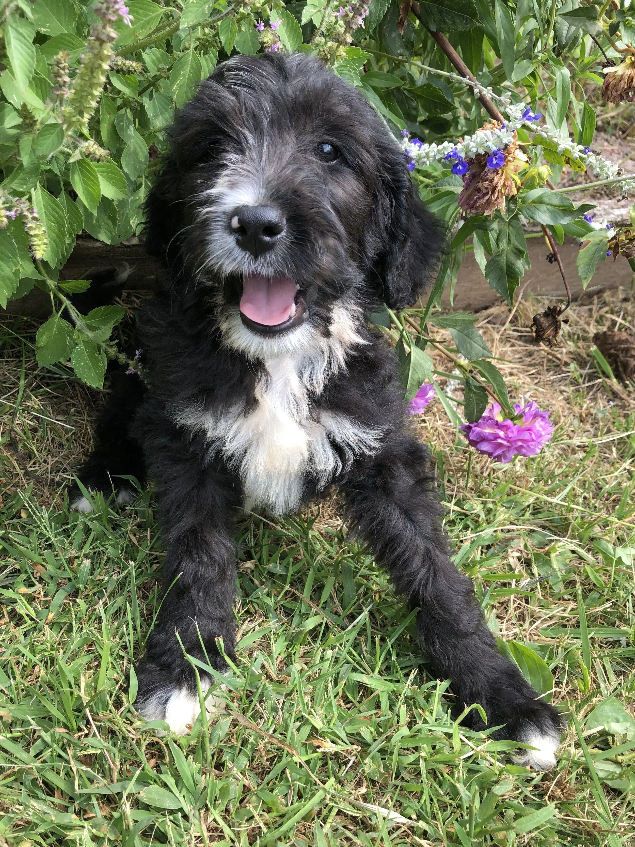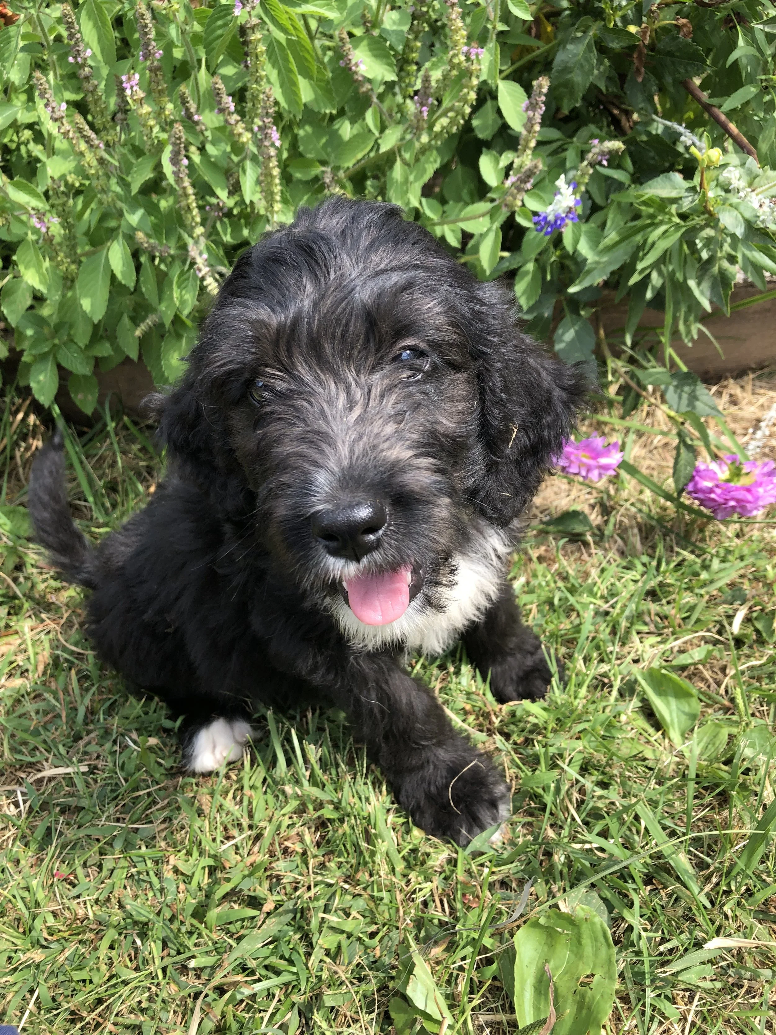 She has 2 boys and 3 girls available. They are all doing really well with the training that we have started. For more information about getting a Bernedoodle please contact us, or fill out our application!